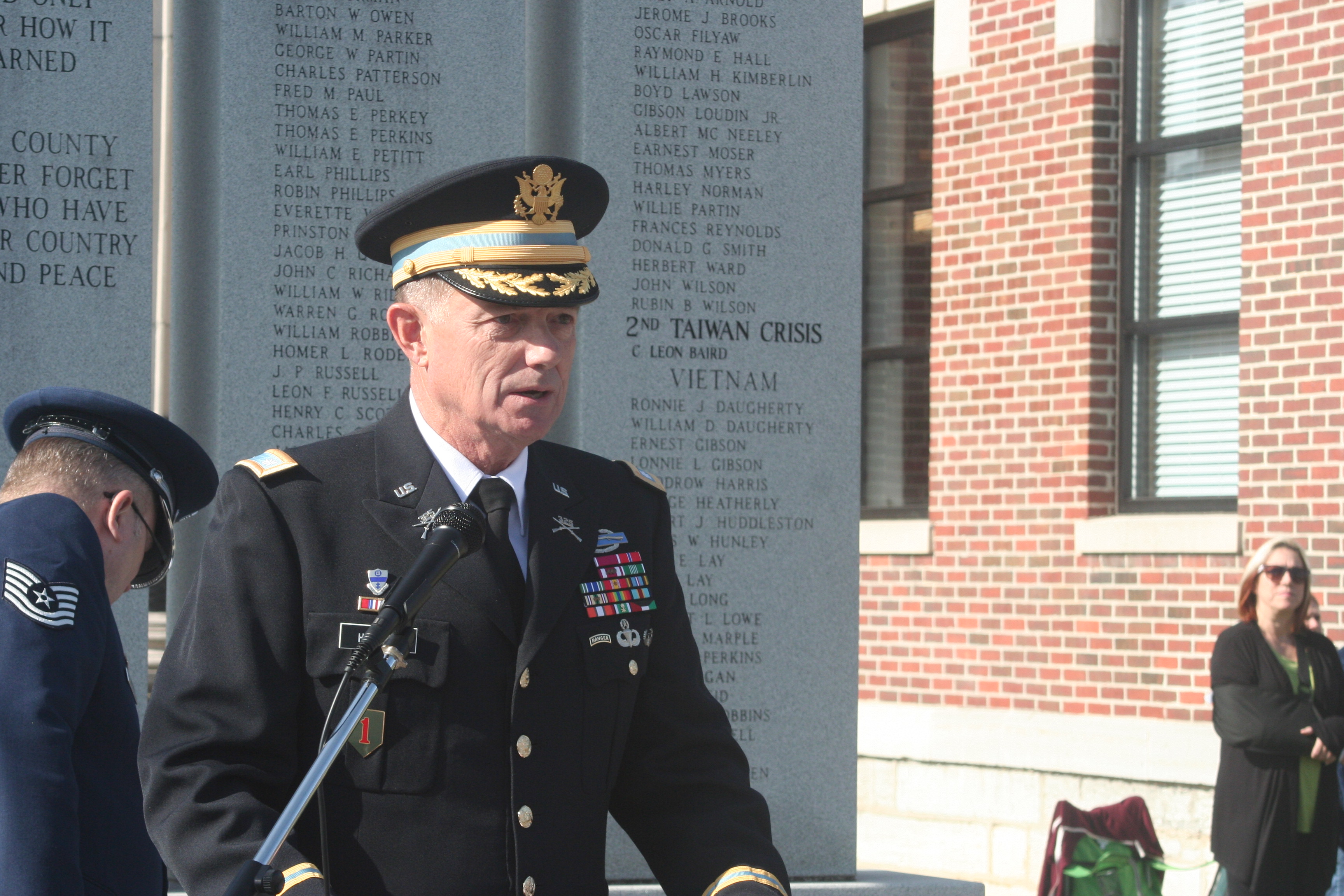 TOP PHOTO: Lieutenant Colonel W. Logan Hickman Jr., retired, is pictured here addressing the Veterans Day attendees on Nov. 11, 2019, on the grounds of the Campbell County Courthouse.