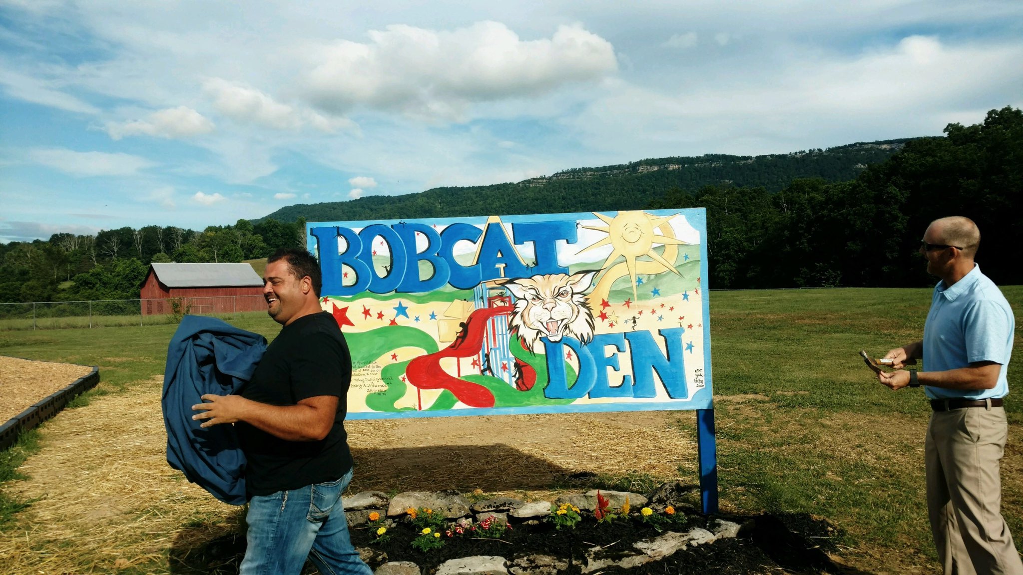 TOP PHOTO:Â As the sun beamed down on this Wednesday morning, Campbell County School Board Member Jeffrey Miller (left) and Valley View Elementary School Principal Jason Dotson unveiled the new playground, the Bobcat Den.