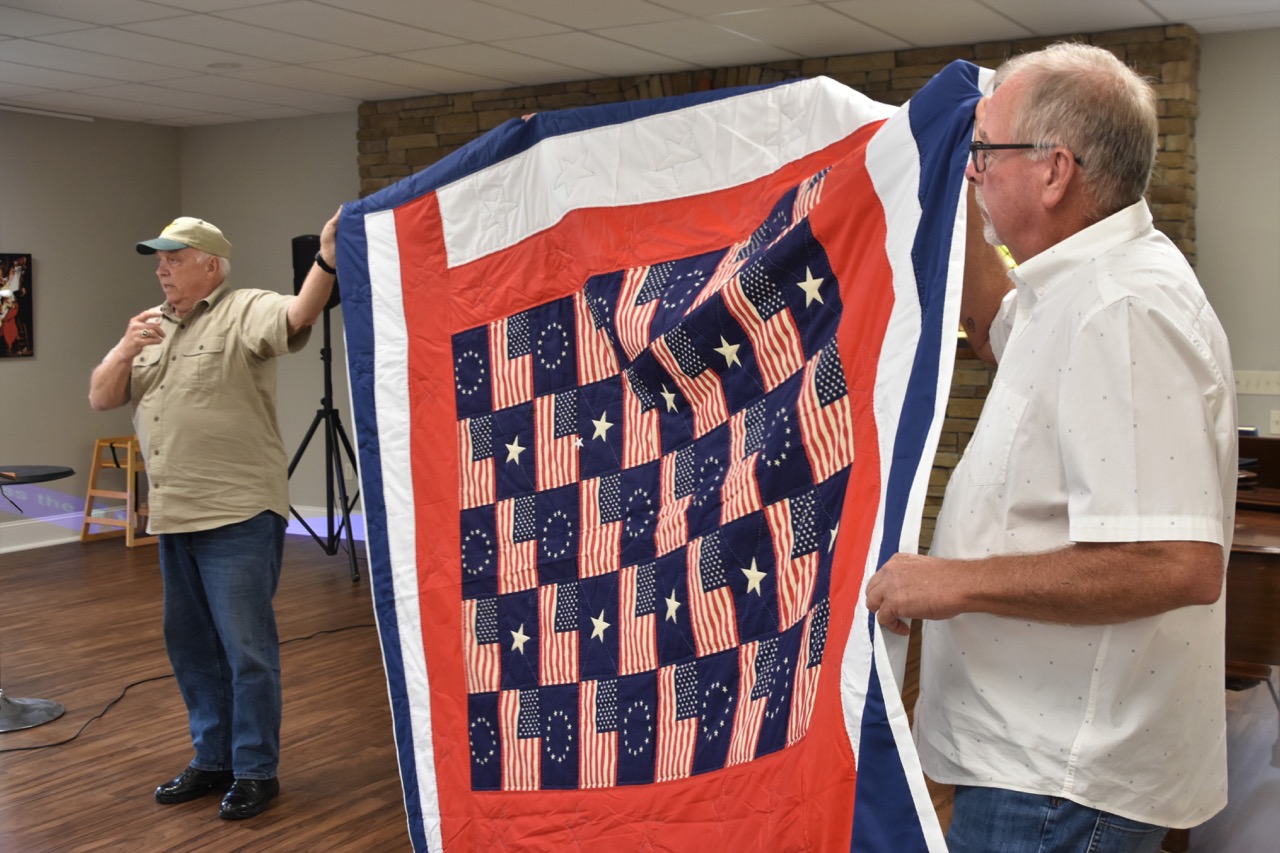 TOP PHOTO: H.R. Douglas (left) and Jerry Broyles display the a beautiful hand stitched quilt that was auctioned.