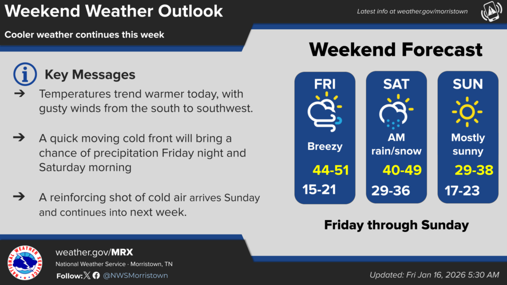 LAFOLLETTE, TN (WLAF)- Temperatures trend warmer Friday, with gusty winds from the south to southwest. Wind chills will hover around freezing on Friday. A quick moving cold front will bring a chance of precipitation Friday night and Saturday morning. A reinforcing shot of cold air arrives Sunday and continues into next week. (WLAF NEWS PUBLISHED-01/16/2026-6AM-TEXT & IMAGE COURTESY OF NWS MORRISTOWN)