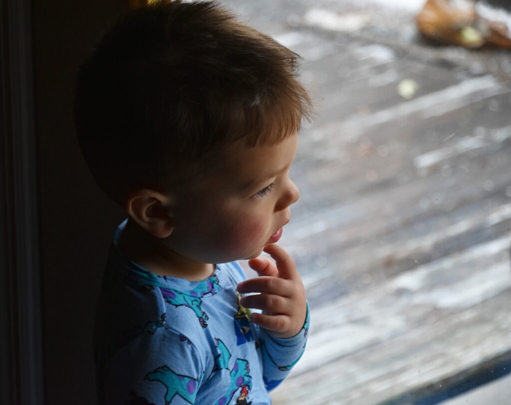 Only 24 hours before, he was outside playing in shorts sleeves and shorts. Monday’s temps were in the 30s as he watched the snow blow across his back yard play ground.