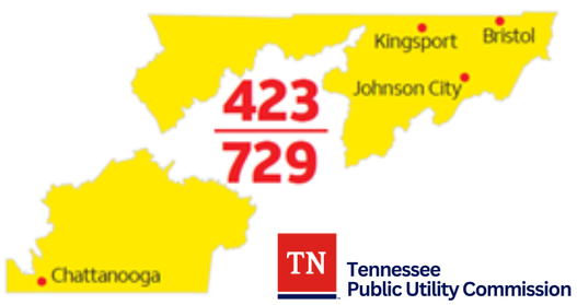 With new telephone numbers in high demand, the Tennessee Public Utility Commission approved the addition of the new 729 area code to the existing 423 area code region, which covers two non-contiguous regions in eastern Tennessee, serving communities such as Bristol, Chattanooga, Johnson City and Kingsport, as well as many other smaller communities. This process is known as an area code overlay.
